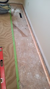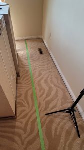 - Measured and cut out a strip of carpet for where the base cabinets will go