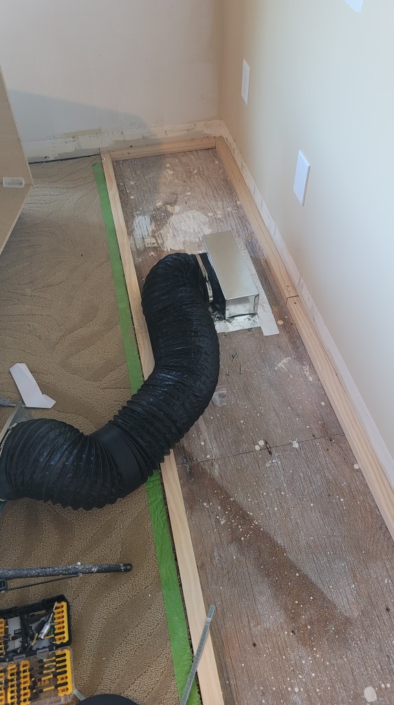 I was pretty proud of myself for getting the venting figured out and the cabinets in place. I tested a piece of baseboard, and it’s a perfect fit.