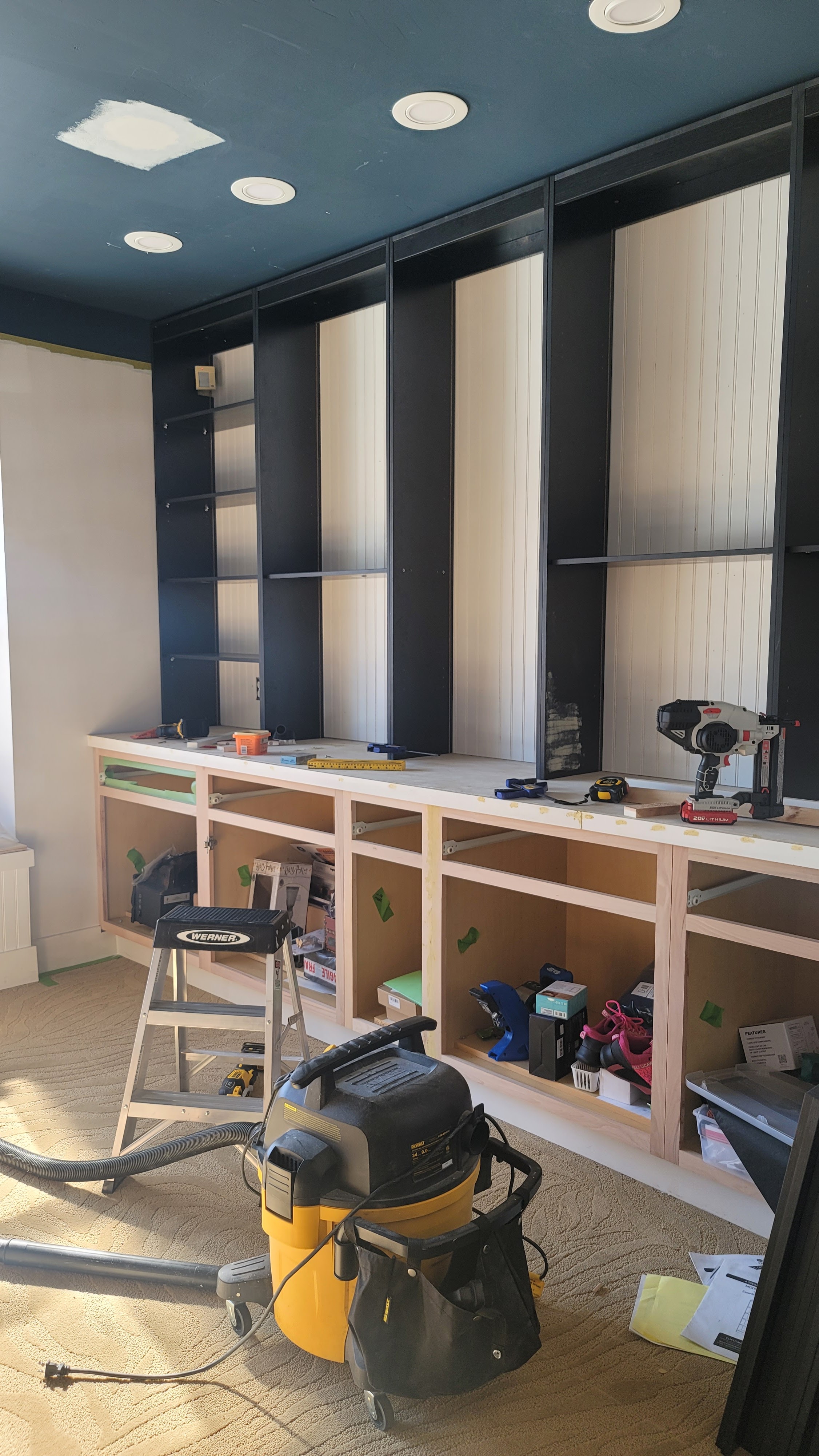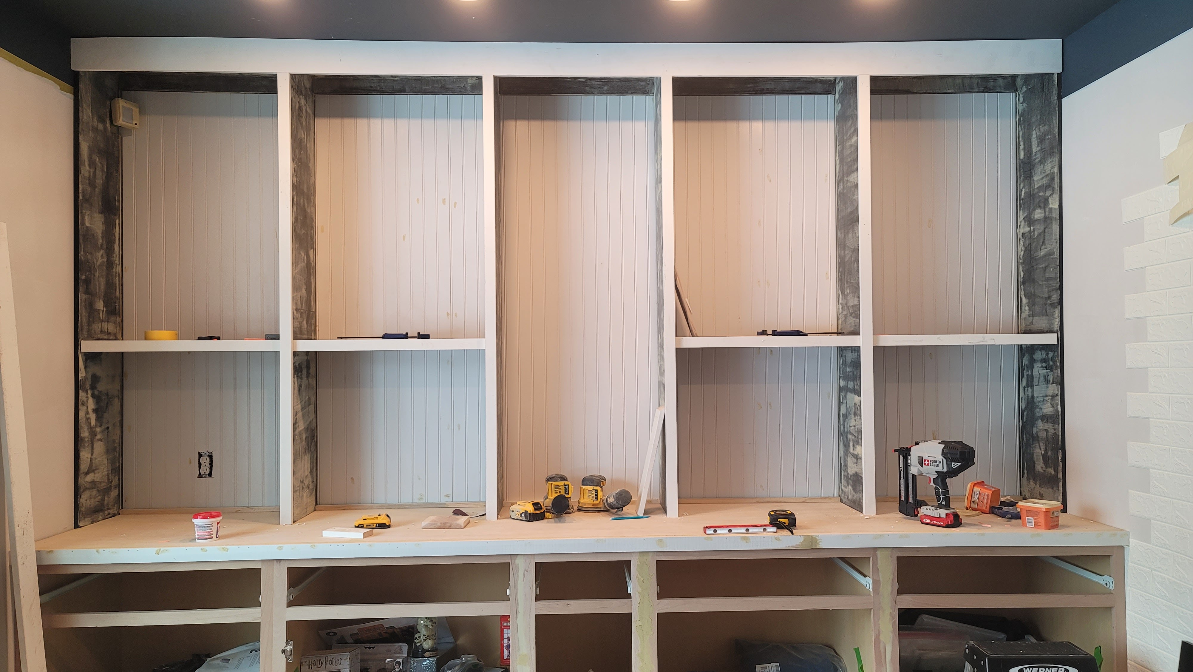 - Beadboard (last-minute addition) installed on the window bench and behind the not-yet-installed shelves